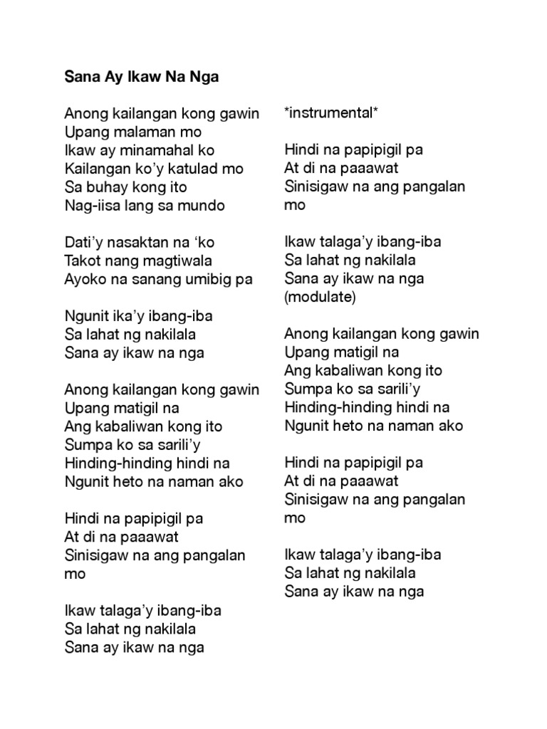 Lyrics taken from ogie_alcasid-sanay_ikaw_na_nga-1572551html. Eb Ebm At di na paaawat. Anong kailangan kong gawin Upang malaman mo Ikaw ay minamahal ko Kailangan koy katulad mo Sa buhay kong ito Nag-iisa lang sa mundo Datiy nasaktan na ko Takot nang magtiwala Ayoko na sanang umibig pa Ngunit ikay ibang-iba Sa lahat ng nakilala Sana ay ikaw na nga Anong kilangan kong gawin Upang matigil na Ang kabaliwan kong ito Sumpa ko sa sariliy Hinding.